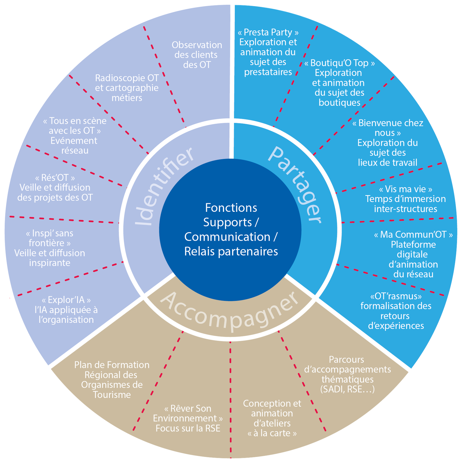 Des actions réunies de manière cohérente par domaines stratégiques, issues de la feuille de route co-construite par le réseau. Chacun des domaines est interconnecté aux autres.